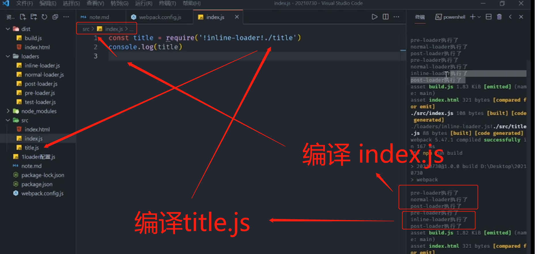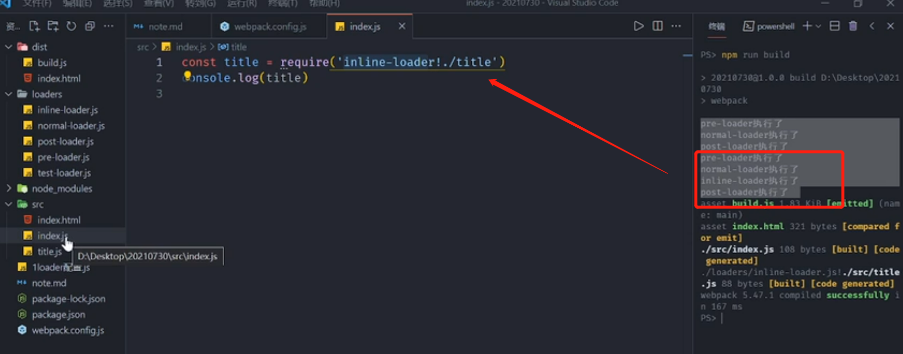 配置跟上图一样,index.js 上import一个行内 loader :